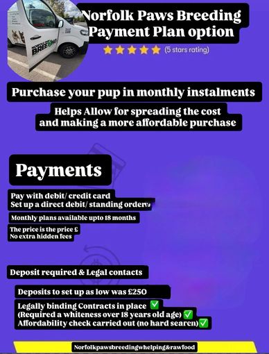 We know that buying a quality and healthy puppy can be pricey, which I‘m proud to be in a position to offer payment plan options as well as the option of accepting debit car/credit card payments through google pay or Apple Pay.